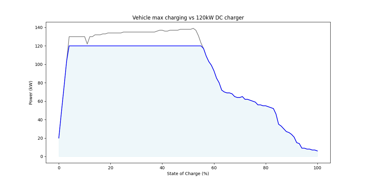 Rhug Estate's chargers are 120kW at maximum. The grey series is the theoretical maximum of the car, and the blue series is the maximum deliverable by the charger. If we plug in at a low percentage, we can see the car will take as much as it can, but by 55% the car starts to manage the battery and backs off power delivery. By 80% charge we're suddenly charging at 50kW, by 90% we're around 20kW. The lesson here is that you're just not meant to charge to 100% on these sorts of chargers (indeed it breaks the unofficial EV driver morality code) but this could be surprising or frustrating if you're doing an extremely long journey where you really do want full charge.
